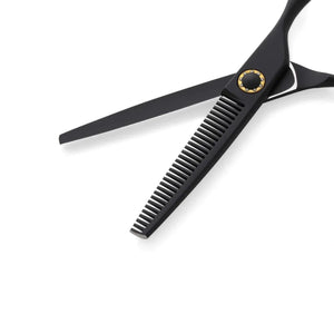 "The Ichiro Matte Black Master Shear Set stands as a paragon of versatility and precision in the world of professional hairdressing. The cutting shears in this collection excel in blunt cutting and slide cutting techniques. These shears truly shine in creating textured looks, offering unparalleled control for point cutting techniques. The inclusion of multiple sizes ensures optimal performance across various hair types and cutting methods, making the scissor-over-comb technique effortlessly executed. The specialized thinning shears in this set are a standout, delivering exceptional texturizing capabilities that result in smooth, natural-looking finishes."