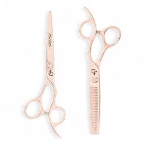Set includes your choice of Ichiro Rose Gold Cutting Shears paired with 6.0" Texturizing Shears with complete professional kit.