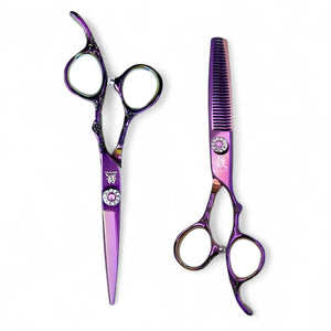 The complete Hanami set represents the pinnacle of Japanese scissor artistry. Two perfectly matched shears with stunning rainbow titanium coating that shifts through purple, emerald, and gold. But these aren't just showpieces - they're precision instruments built for commercial-grade performance.
