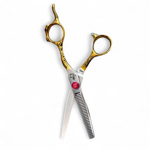 Every element tells the dragon story. From the ornate gold scales that wrap both handles to the matching tension adjusters bearing the dragon emblem. But beneath the theatrical exterior beats the heart of serious professional tools. SUS440C steel, 3D convex edges, and engineering that delivers whisper-quiet, effortless performance.