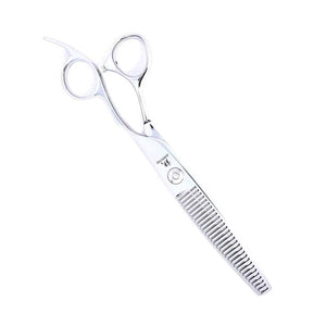 "The Juntetsu VG10 Offset Master Shear Set redefines versatility in professional hairstyling. Its range of cutting shears excels in precision work, from detailed texturing to effortless blunt cutting. The thinning shears offer unparalleled control in creating seamless, natural-looking textures. The ergonomic offset handle enhances comfort and accuracy during intricate techniques like scissor-over-comb. This comprehensive set adapts flawlessly to diverse cutting methods, establishing itself as the ultimate toolkit for discerning stylists committed to perfection in every cut."