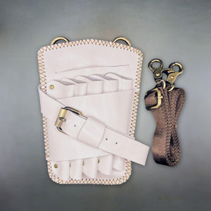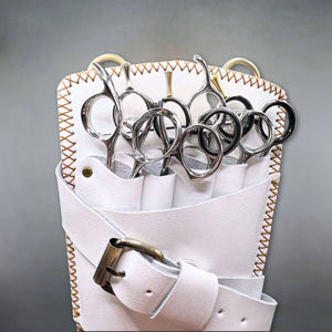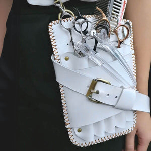 "This white holster is absolutely stunning - it's like carrying a piece of art that actually protects your tools! The hand-stitching detail is incredible, and that contrast threading really makes it pop. Love how the adjustable belt lets you customize the fit perfectly for your tools. Been using it for my collection of Juntetsu and Kasho scissors, and it's holding up beautifully. The white leather is surprisingly practical - shows you exactly how clean your tools are! The brass hardware adds this perfect touch of elegance, and the construction is solid enough for daily use. What really impresses me is how it manages to be both beautiful and functional - perfect for high-end salons where appearance matters as much as performance. If you're looking to make a statement while protecting your premium tools, this is definitely the way to go!"