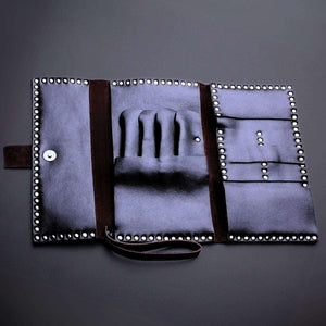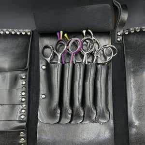 "As someone who works with premium Jaguar and Yasaka scissors daily, this wallet is exactly what we've been looking for. The studded design isn't just about looks - it actually reinforces the whole structure! Love how the separate compartments keep my scissors from touching each other.. no more worrying about my Kamisori razor getting knocked around. The rope closure is brilliant, much more reliable than magnetic clasps that wear out. Been using it for everything from my 6-inch cutting shears to my texturizing scissors, and even my premium combs fit perfectly in the extra slots. Really worth investing in if you're serious about protecting your premium tools!"